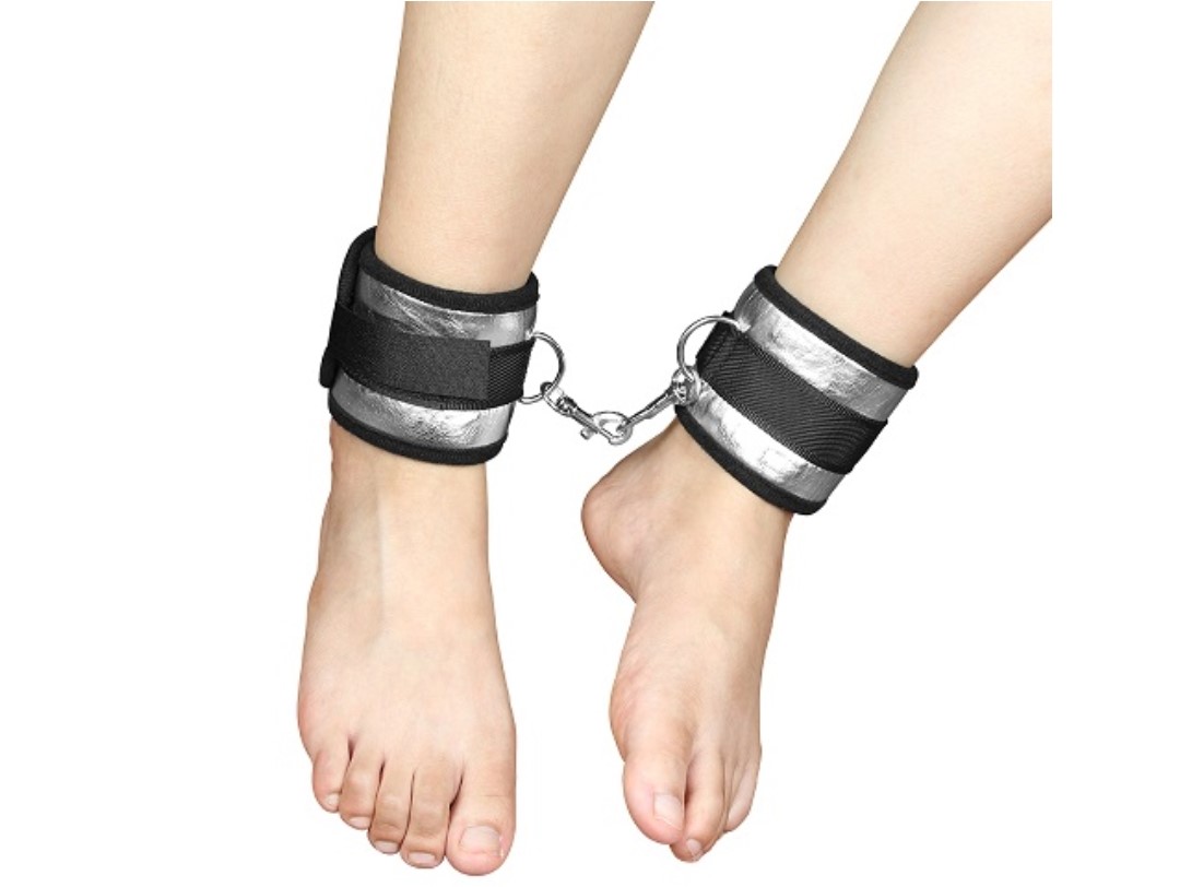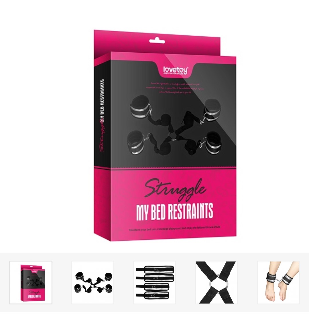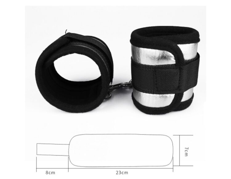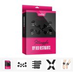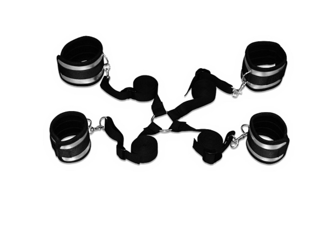 4 soft restraints with velcro fastening make easy work of full body bondage, whilst the soft blindfold restricts your lovers vision for total submission. Connect the cuffs together as handcuffs or ankle restraints using the incorporated swivel clips, or append them to the included bed straps for a firmer restraint that securely binds you to your bed.