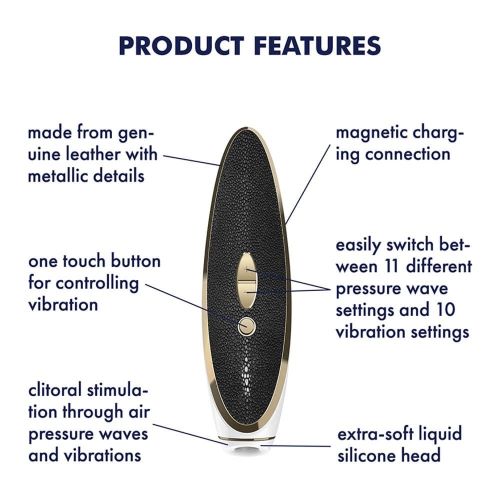 Με εύπλαστο και κομψό τρόπο, το δαχτυλίδι της εξαιρετικά μαλακής, ιατρικής ποιότητας υγρής σιλικόνης περιβάλλει το σφαιρίδιο ευχαρίστησής σας και το χαϊδεύει με τη συνήθη συγκλονιστική διέγερση κυμάτων πίεσης Satisfyer που κόβει την ανάσα. Οι διαισθητικοί έλεγχοι σάς επιτρέπουν να επιλέξετε τα αγαπημένα σας από 11 διαφορετικές ρυθμίσεις έντασης και να απολαύσετε την παραδεισένια αίσθηση της διέγερσης της κλειτορίδας χωρίς επαφή. Το εργονομικό σχήμα του Satisfyer Luxury Prêt-port-porter κάθεται άνετα στο χέρι σας, ενώ το εκλεπτυσμένο επάνω μέρος από δέρμα με αισθητική δομή θα σας κάνει να νιώσετε σαν βασίλισσα. Τα ροζ χρυσά στοιχεία από πολύτιμο μέταλλο και το μεταξένιο, ματ σώμα σε απαλό ροζ συμπληρώνουν τέλεια το πολυτελές σχέδιο.