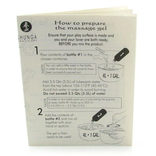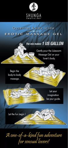 Ρίξτε απαλά το χλιαρό Gel Massage στο σώμα του αγαπημένου σας. Ξεκινήστε το μασάζ σώμα με σώμα. Αφήστε τη φαντασία σας να είναι ο οδηγός σας. Αφήστε τη διασκέδαση να ξεκινήσει! Όλες οι οδηγίες απεικονίζονται στο μπροστινό μέρος της συσκευασίας.