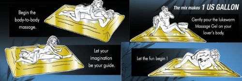 Το τζελ, χυμένο εξ ολοκλήρου σε 2 γυμνά σώματα, επιτρέπει στους εραστές να γλιστρούν ο ένας πάνω στον άλλο με μια κίνηση ολίσθησης.