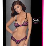 Ασύρματο σουτιέν και σλιπ χωρίς καβάλο από απαλή, ελαστική δαντέλα σε δύο διαφορετικά χρώματα. Υπάρχουν επίσης διακοσμητικοί φιόγκοι στο μπροστινό μέρος. Το σουτιέν ¾ κούπας καλύπτει μόνο τις θηλές. Το σουτιέν έχει επίσης κούμπωμα με γάντζο στο πίσω μέρος και οι τιράντες είναι ρυθμιζόμενες. Σλιπ χωρίς καβάλο – είναι ανοιχτό και στην περιοχή των γλουτών.