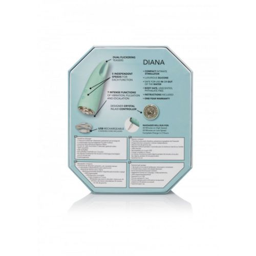 The sparkling Pavé Diana is a travel size vibrator with dazzling crystal adornments, tickling dual teasers, and 35 sensational vibration settings for a one-of-a-kind pleasure experience. Two teasing tips, an erotically contoured shape and 100% play area are perfect for teasing your favorite pleasure points. The flickering tips and discreet size want to deliver pinpoint pleasure, wherever you go. This silky-smooth vibrator is packed with 7 functions of vibration and 5 independent speeds for each function for stimulation made just for you. The easy-touch control buttons let you effortlessly flicker through each function of vibration, while increasing or decreasing the function intensity. Whether you’re taking a dip with a lover or indulging in a steamy solo session, look forward to up to 2 hours of waterproof vibration. Recharge pleasure and get back to playtime in only 2 hours with the provided USB cable. The hypoallergenic luxury teaser is made from Satin Finish silicone with glass crystal adornments.
