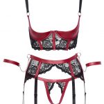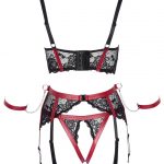 Σετ από την Cottelli BONDAGE: Σουτιέν με ράφι με ελαφρά επένδυση, συρματόσχοινο, ζαρτιέρες και κορδόνι χωρίς καβάλο από ελαστική δαντέλα σε συνδυασμό με όμορφη ματ εμφάνιση. Το σουτιέν με ράφι είναι μακρύ, έχει κούμπωμα με γάντζο στο πίσω μέρος και ελαφρώς φαρδύτερους ιμάντες που ρυθμίζονται. Υπάρχουν αφαιρούμενες χειροπέδες/ βραχίονες με αλυσίδες που μπορούν να στερεωθούν στους δακτυλίους και στις δύο πλευρές της ζώνης ανάρτησης. Τα στενά στηρίγματα διαθέτουν ρυθμιζόμενους συνδετήρες με γάντζο και βρόχο. Η ζώνη ανάρτησης διαθέτει κλιπ στο πίσω μέρος και 6 ρυθμιζόμενους ιμάντες ανάρτησης. Η χορδή που ταιριάζει είναι χωρίς καβάλο.