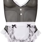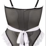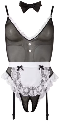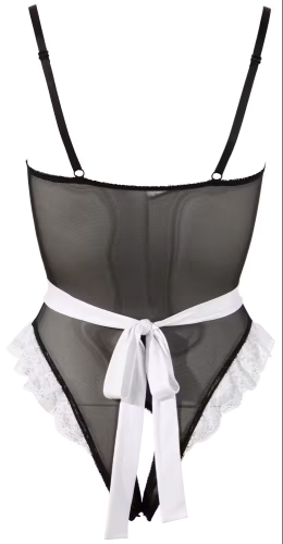 The lace decorated crotchless body has adjustable straps and detachable suspenders.