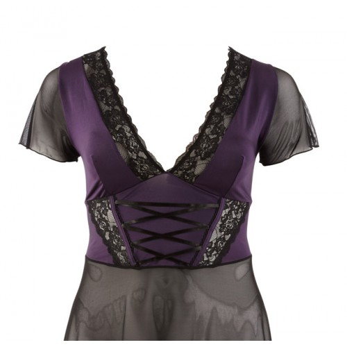 Slightly flared short sleeve black chemise with purple inserts at the front and decorative lacing.