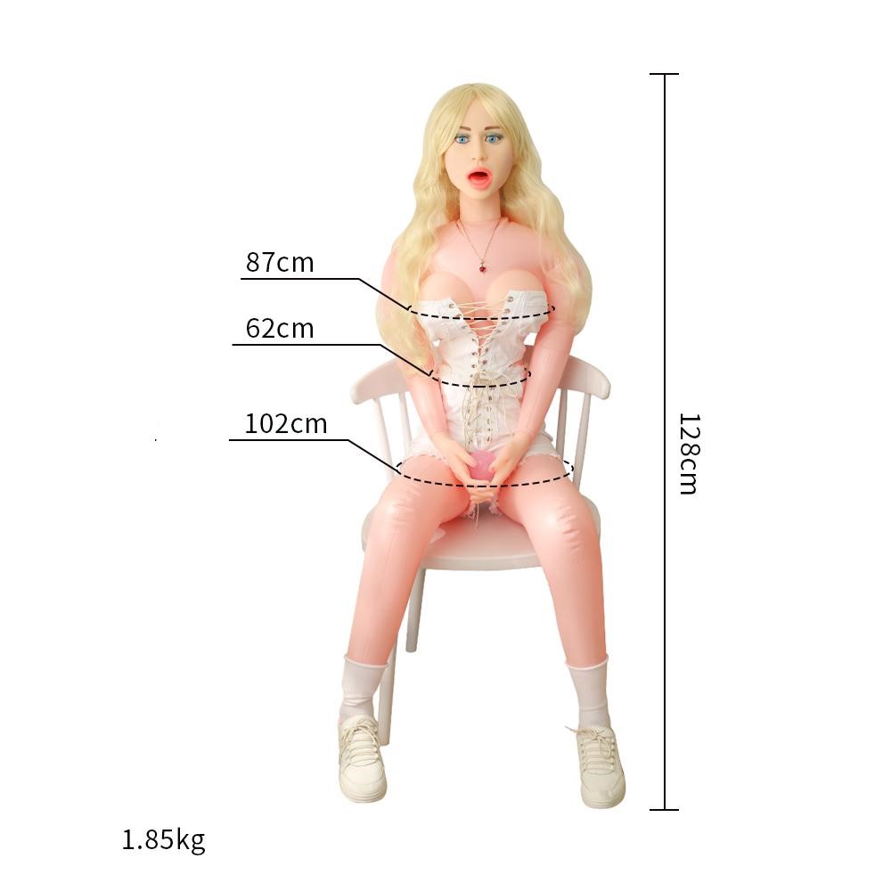 Dolores blonde with blue eyes and with sexual voice a pure magic….. This exclusive inflatable doll will satisfy even the most demanding gentleman! The beautiful body of a model that will show all her values in front of you. A beautiful inflatable doll with a charming three-dimensional face with an open soft mouth, natural hair and a sitting position that is tempting and impressive. She is in life size (height), has beautiful, large and firm breasts with erect nipples. In addition, she has three-dimensional / realistic legs and arms. 2 tempting love holes (vagina and anus). The doll is distinguished by both functionality and aesthetics. Dolores offers you the perfect flexibility for any position you want to take her. She is waiting for you impatiently !!!!