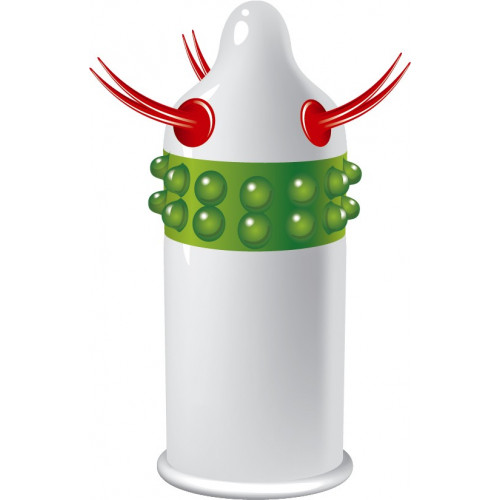 Extravagant latex condom from Egzo to give extra pleasure and providing high security at the same time. Condom with 2 green lines of beads surround the tip of the penis and 3 sets of red spikes on the tip. Key Features: Length 18 cm Diameter 52 mm (+ / – 2 mm) The thickness of the wall: 0.06 mm Oil based lubrication