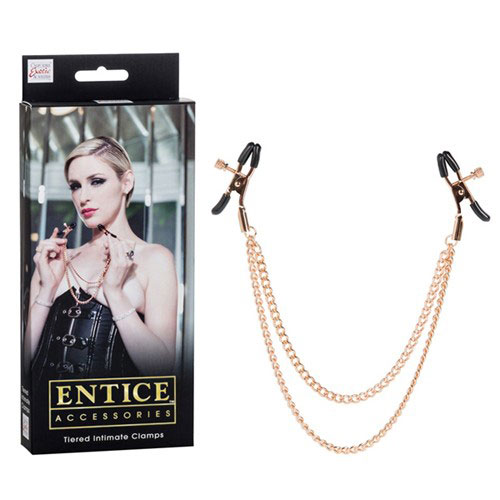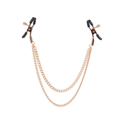 An erotic pair of sensual gold nipple clamps that are joined with 2 gold chains, torment yourself with pleasurable nipple pain or have your lover control your desire by tugging and twisting the chain when needed to control your eroticism. The amount of pressure you apply to the nipple is adjustable using the stem screw.