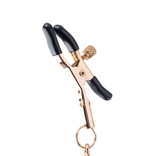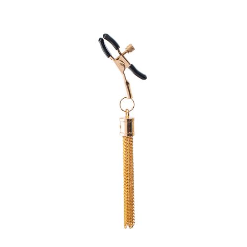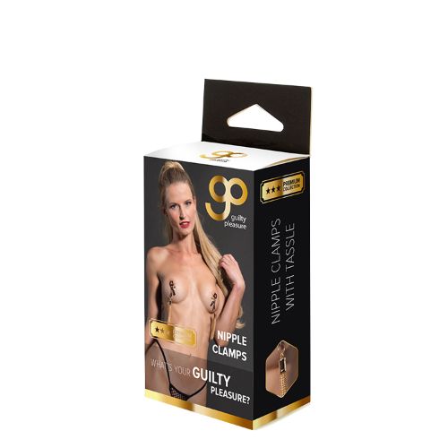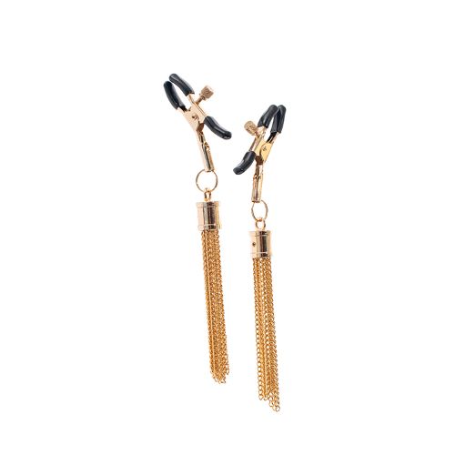 Αυτό το σετ σφιγκτήρων θηλής από τη συλλογή Guilty Pleasure BDSM έχει μια κομψή φούντα σε χρυσό χρώμα, η οποία προσθέτει στην εμπειρία κάνοντας τους σφιγκτήρες βαρύτερους. Η πίεση των σφιγκτήρων μπορεί να ρυθμιστεί με μια βίδα και οι άκρες έχουν καλύμματα PVC για προστασία του δέρματος.