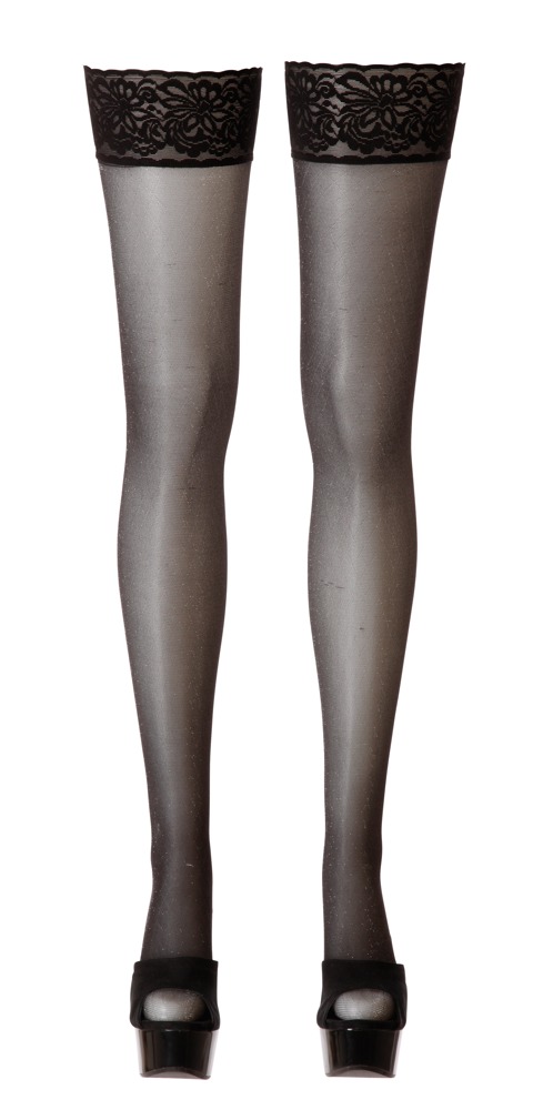 Hold-up stockings with an 8 cm wide lace part around the top. The silicone on the inside makes sure that they stay in position. The stockings have fine, soft glittery threads. Foot part is slightly pre-formed. Black. 80% polyamide, 10% polyester, 10% elastane. Oeko-Tex certified.