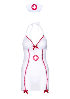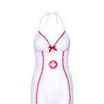 Hot Nurse Roleplay Set – Hot Nurse σετ ρόλων, που περιλαμβάνει ένα μίνι φόρεμα halter από δαντέλα και διάφανο πλέγμα, ένα ασορτί κορδόνι, κάλτσες και ένα headpiece