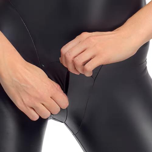 Η εφαρμοστή, αμάνικη ολόσωμη φόρμα από την Cottelli PARTY έχει μακριά, στενά μπατζάκια. Είναι κατασκευασμένη από μοντέρνο μαύρο ματ υλικό με ασημί μεταλλικές λεπτομέρειες. Εφαρμόζει σαν δεύτερο δέρμα, αλλά είναι επίσης απαλή και ελαστική για πολύ άνετη εφαρμογή. Η ζώνη με διακοσμητικούς κρίκους, τρουκς και κουμπιά τονίζει τον λαιμό, το ντεκολτέ και τη μέση και μπορεί να ρυθμιστεί σε διάφορα σημεία. Μπορεί επίσης να αφαιρεθεί εντελώς. Τα ασύρματα cups μπορούν να ανοίξουν χάρη στα κουμπιά. Οι τιράντες μπορούν να ρυθμιστούν στο πίσω μέρος όπως επιθυμείτε. Το φερμουάρ 3 κατευθύνσεων είναι πρακτικό και ερωτικό. Μπορεί να κλείσει και να ξεκλειδωθεί με διάφορους τρόπους – από την κάτω πλάτη, πάνω από τον καβάλο και μέχρι την ηβική περιοχή.