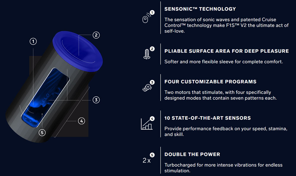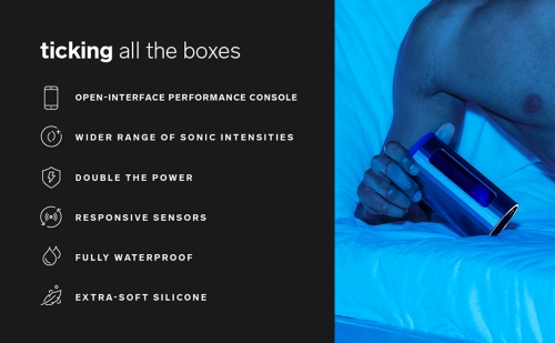 Εκτός από απίστευτους οργασμούς, θα έχετε δεδομένα σχετικά με την εξέλιξη του παιχνιδιού σας και μια επισκόπηση των επιδόσεων και της αντοχής σας. Η έντονη εμπειρία διασφαλίζεται από 2 ισχυρά μοτέρ, την οδοντωτή υφή της εξαιρετικά μαλακής επιφάνειας και την τεχνολογία SenSonic™ που ερεθίζει με κύματα σε όλο το μήκος και την περιφέρεια του πέους.