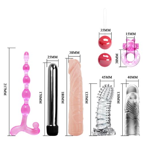 The kit includes seven wonderful items, for pure pleasure. The silver multi-speed bullet and 2 sleeves will satisfy your deepest desires. Try the translucent vibrator for the sensation of realistic sexual pleasure. Place the cock ring on your lover, and the sensation will tickle and excite your clit with every thrust. The wonderful anal beads will take away any erotic taboos that you had, while the sensational balls can tempt your vagina or anus for something different. Everything you need for the ultimate sexual experience!