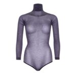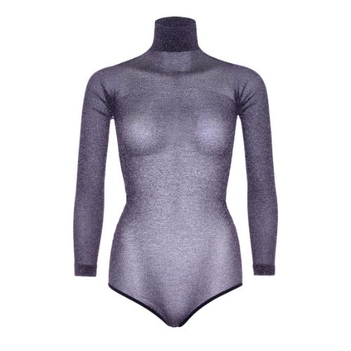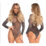 Γυαλιστερό κορμάκι με μακριά μανίκια lurex με ψηλό λαιμό, με κουμπωτό καβάλο και εσώρουχο γεμάτη πλάτη. ONE SIZE