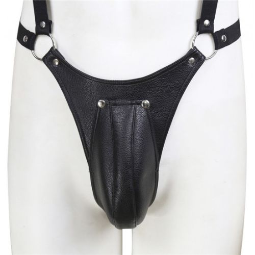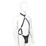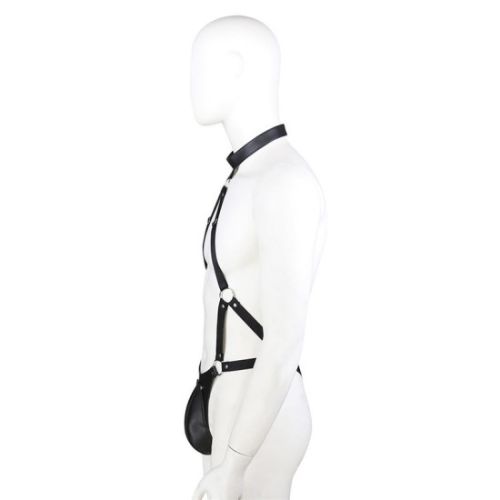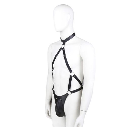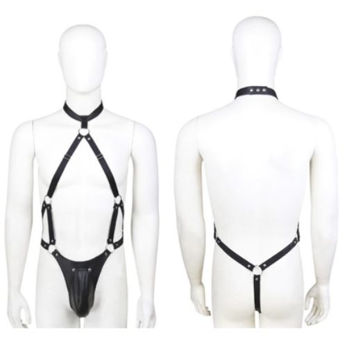 ‘Ένα ξεχωριστό αξεσουάρ κατασκευασμένο από συνθετικό δέρμα. Κλουβί πέους ενωμένο με λουριά που αγκαλιάζουν το σώμα και καταλήγουν με δέσιμο γύρω από τον λαιμό. Αυτή η 100% χειροποίητη στολή είναι σχεδιασμένη με το πιο απαλό δέρμα μας.