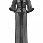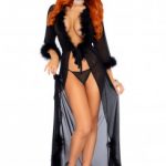 Robe-Kimono in red transparent fabric with black fur on the ends. Includes 3 pieces. The robe, belt and black thong
