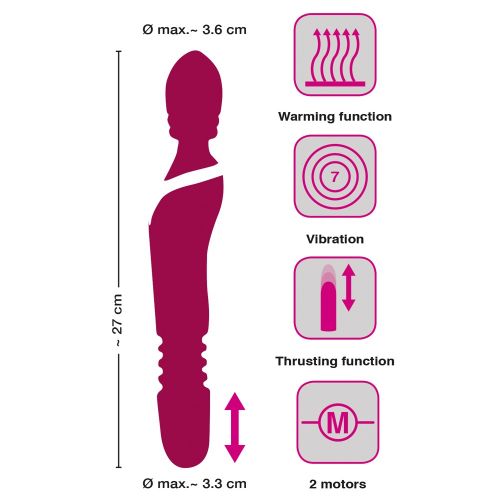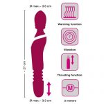 Massage wand with a warming function as well as 7 vibration modes and 3 thrusting speeds. Both ends can be used and the thrusting speeds and vibration modes can be controlled separately at the push of a button. The vibrator’s head is movable, while the shaft not only thrusts but also rotates. Perfectly suited for long massages of tensed up areas and the intimate area. A USB charging cable is included.