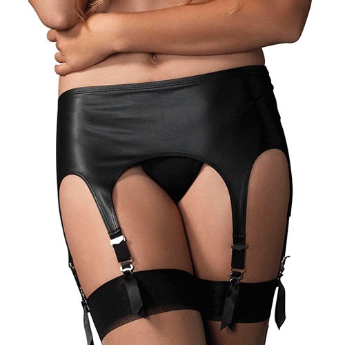 Matte rubber look six garter belt with adjustable straps and hook-n-eye closure.