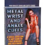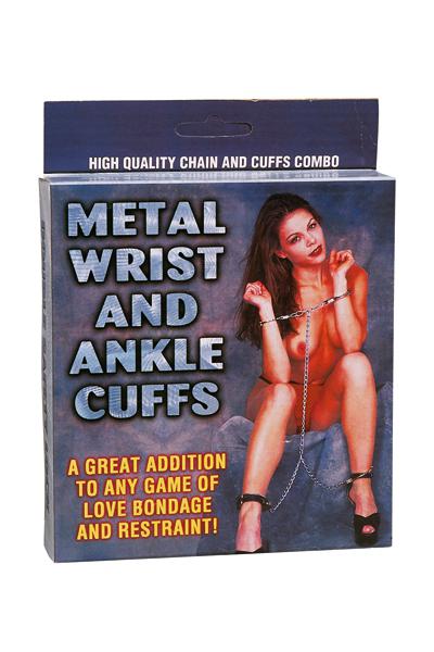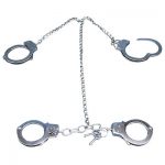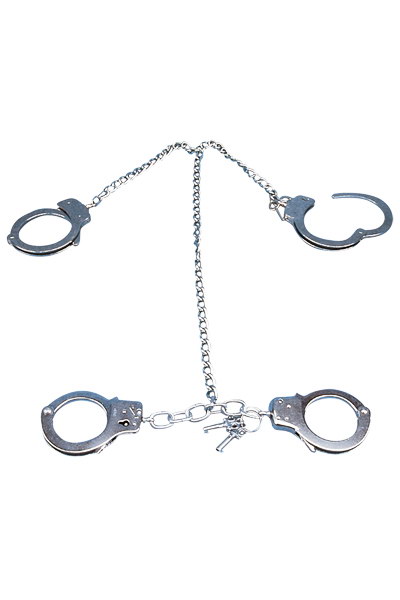 Together ankle cuffs and chrome steel. Robust design. Supplied with 2×2 keys. Safety latch (bracelets only). Length chains: Hands: 11cm – Feet: 46cm – Central: 40cm.