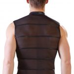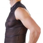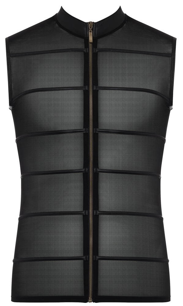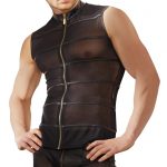 Show off your muscles because this sleeveless black powernet shirt will make them the centre of attention. The transparent material is broken up by matte black stripes that add that exciting touch to the shirt. The stretchy high-neck shirt has a small stand-up collar and can be unzipped in the blink of an eye because of the full-length zip at the front…