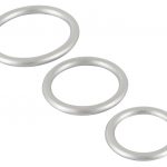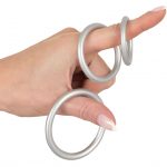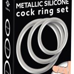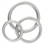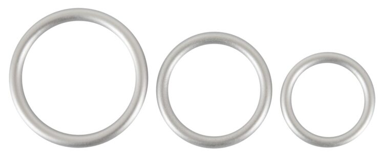 Three different sized cock/ball rings in a set. In an dangerous metal look with the comfort and safety of silicone. Very flexible so that they can be placed over the penis and testicles easily to create rock hard erections that last a long time.