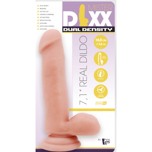 This Mr Dixx 7.1 inch Dual Density dildo has a firm core with a softer, lifelike outside. This is called Dual Density and it adds to the experience during use: penetration will feel like it’s the real thing! The glans and scrotum also contribute to this experience. The dildo has a suction cup base, so that it will stick firmly to any smooth surface and so that is compatible with strap-on harnesses. Made of anti-bacterial TPE, free of phthalates and latex, non-smelling and body safe.Need the specific powder for maintenance.