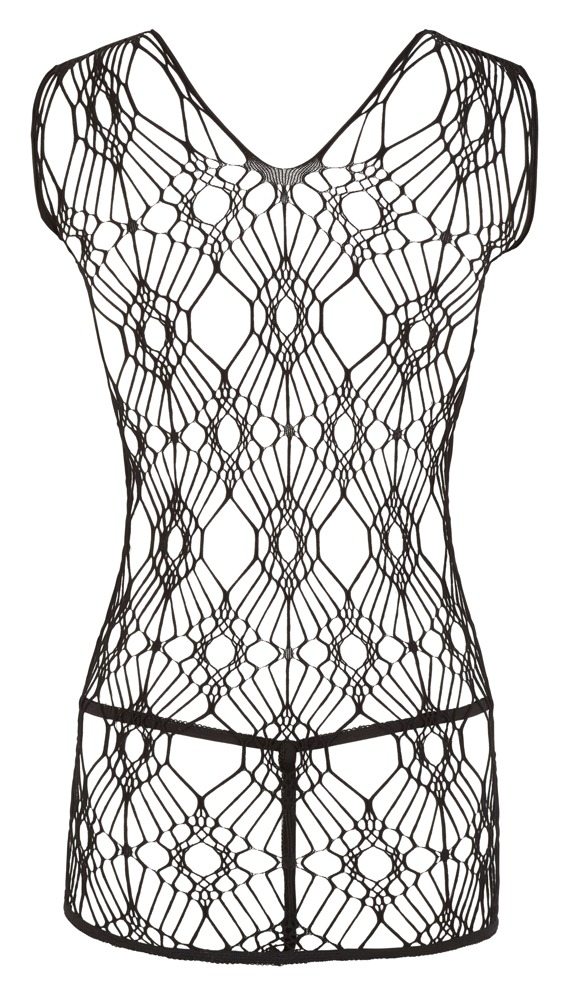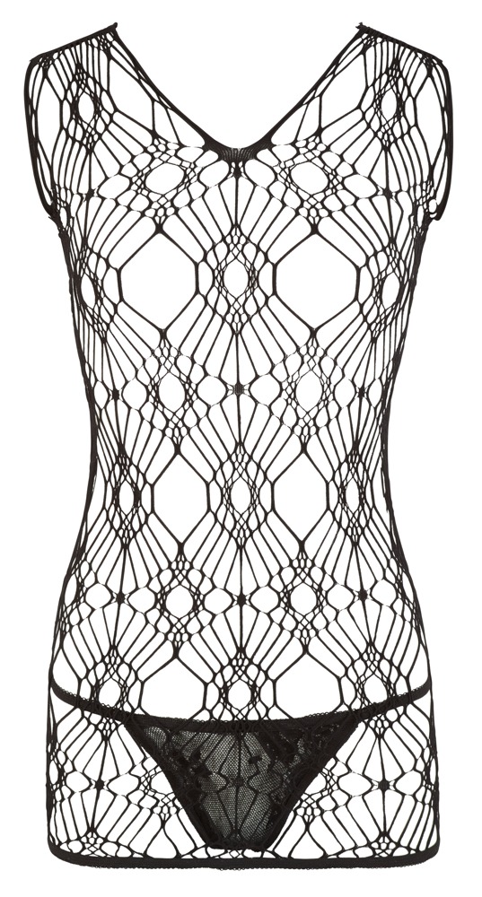 This slightly loose-fitting black mini dress is made out of coarse woven, stretchy net material and is perfect to wear over a bra or top. Includes a lace string. 90% polyamide, 10% elastane.