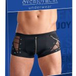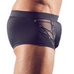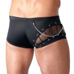 Pants made out of a trendy combination of opaque and transparent (fishnet) material. With a removable decorative chain and zip at the front. Black. Very stretchy.