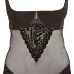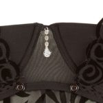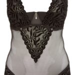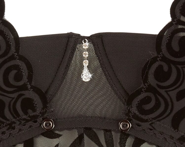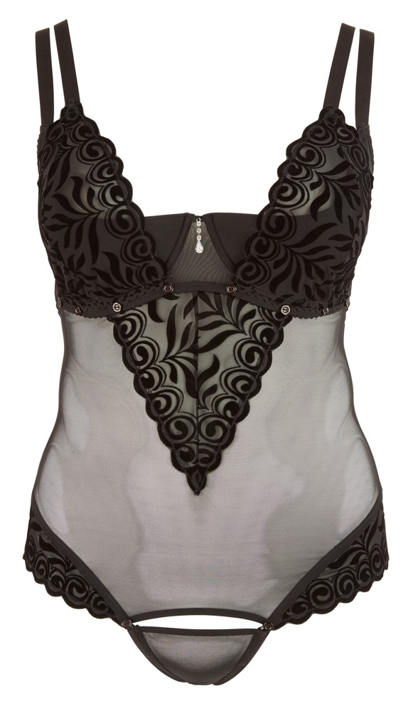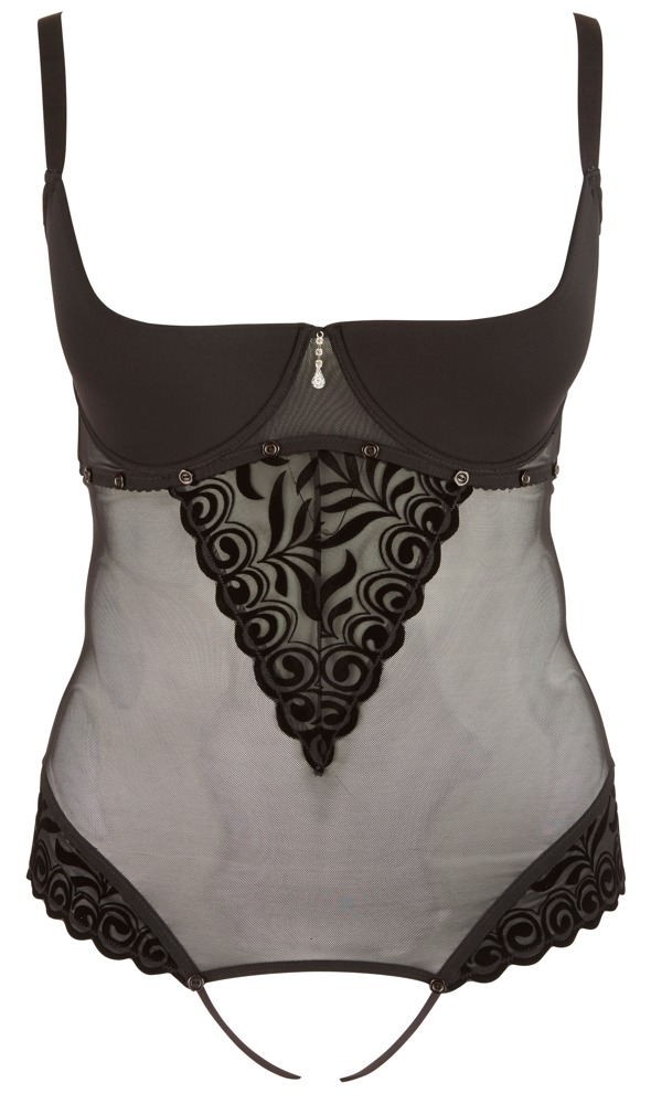 This black strip body is made out of transparent powernet and allows cheeky glimpses. It also has beautiful flock print inserts. The sparky rhinestones in the cleavage area finish off this seductive look perfectly. However, this erotic outfit has more to offer! The string and the cups can be unbuttoned and removed completely. Now the padded, underwired shelf bra cups can be shown off in all their glory… With a hook-fastener at the back and adjustable straps. 90% polyamide, 10% elastane.