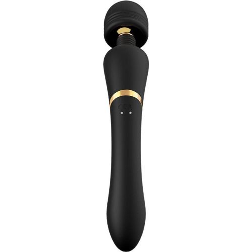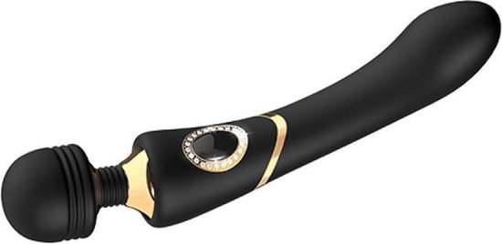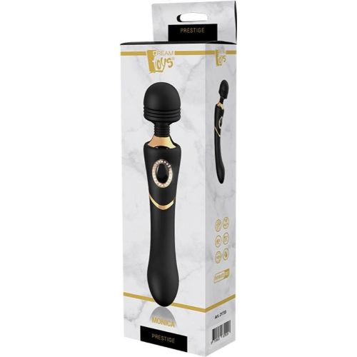 The Monica wand stimulator from the Prestige collection by Dream Toys is a black wand with stylish gold coloured accents, a gem shaped button, a firm sturdy handle, a rounded head and a flexible neck. Monica has a powerful motor that offers 7 vibration patterns and 3 speeds. The Monica wand vibrator is rechargeable with the included magnetic USB cable. It is made of soft solid silicone and ABS, IPX7 waterproof and body safe, phthalate-free and latex-free. Operation can be done with the one touch gem shaped button that lights up with blue LED light when activated.