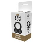 This Ramrod penis ring features an extension that holds up to 2 small weights. Each grooved hole in the extension supports a 57-gram removeable steel ball that locks securely into place. The penis ring is stretchy and comfortable and fortifies erections, with incremental weight increases up to 114 grams in total. Made of soft and smooth, body safe silicone and steel.
