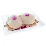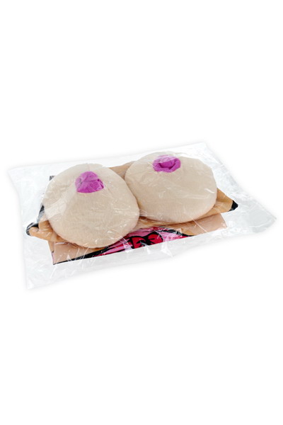 Sexy apron with stuffed breasts. It is tied at the back and neck. Body printed pink thong. Satin edges.