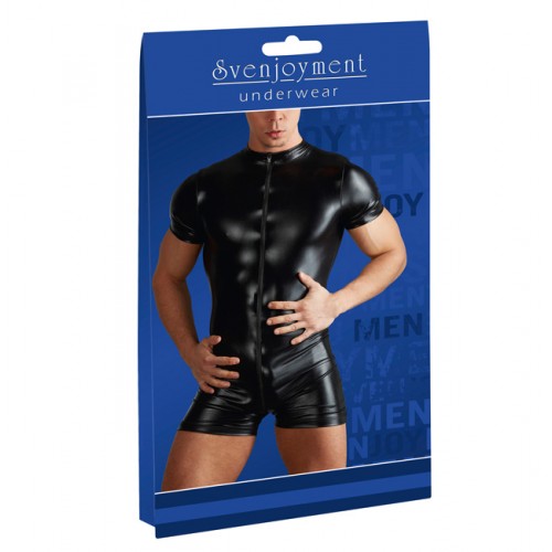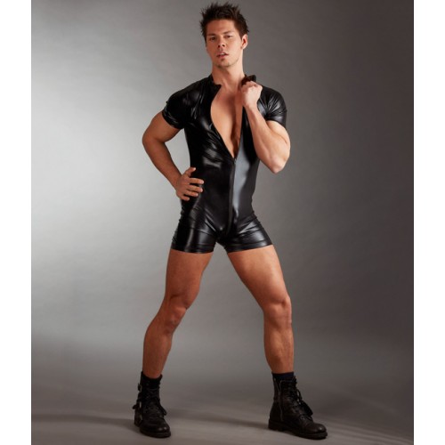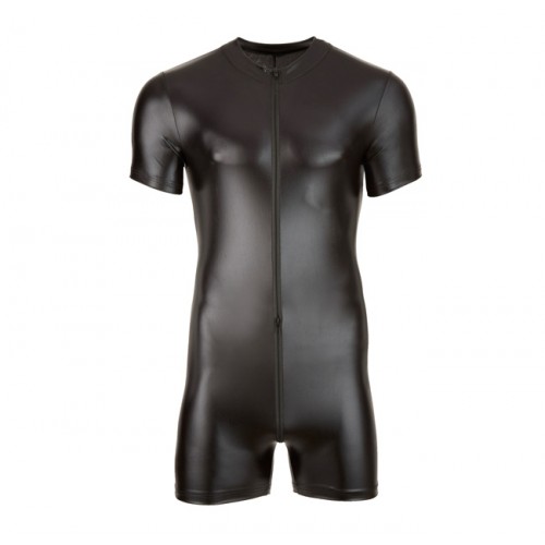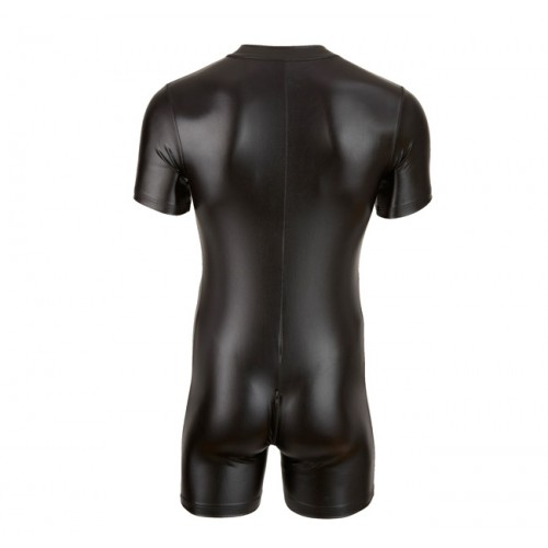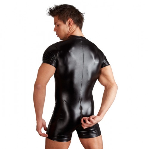 Shiny black wetlook playsuit with a small stand-up collar and 3 part zip at the front that goes over the crotch and stops at the buttocks.