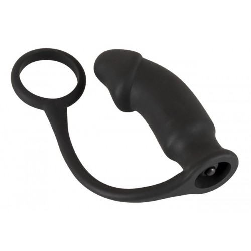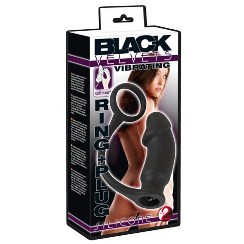 Black silicone cock ring with attached vibrating butt plug from Black Velvet Germany.