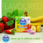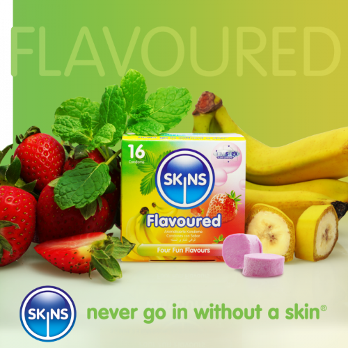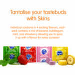 Τα προφυλακτικά με γεύση Skins κατασκευάζονται με φυσικό λάτεξ υψηλής ποιότητας για καθαρή, φυσική αίσθηση, ισχυρό προφυλακτικό. Τόσο λεπτές που αισθάνονται σαν δεύτερο δέρμα! Ποτέ μην μπείτε χωρίς δέρμα! – Χωρίς μυρωδιά λάτεξ – Διαφανές χρώμα – Φυσική αίσθηση – Εξαιρετικά λιπασμένο για ασφάλεια και άνεση. Τα φυσικά προφυλακτικά Skins έχουν μήκος 190mm, ονομαστικό πλάτος 52mm. Όταν χρησιμοποιούνται σωστά, τα Skins Natural Condoms μειώνουν σημαντικά τον κίνδυνο εγκυμοσύνης και σεξουαλικά μεταδιδόμενων λοιμώξεων, αν και καμία μέθοδος αντισύλληψης δεν μπορεί να σας προσφέρει 100% προστασία. Παρακαλώ διαβάστε το φυλλάδιο.