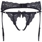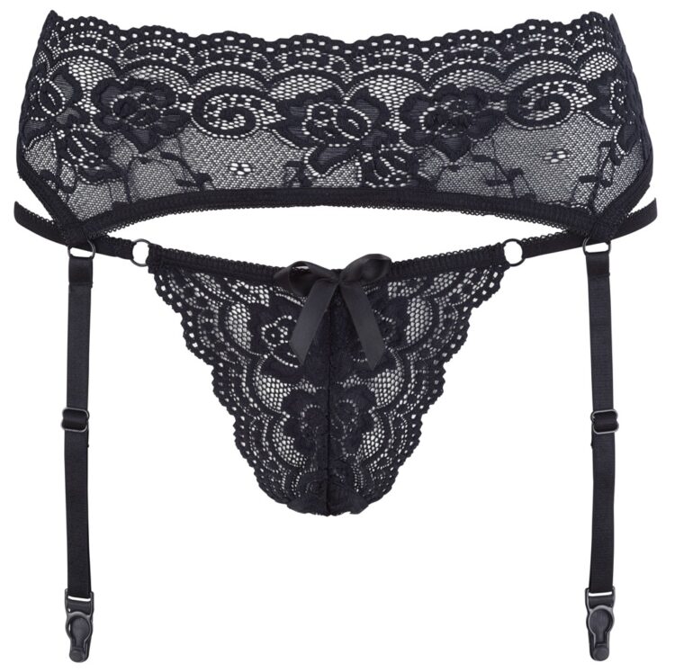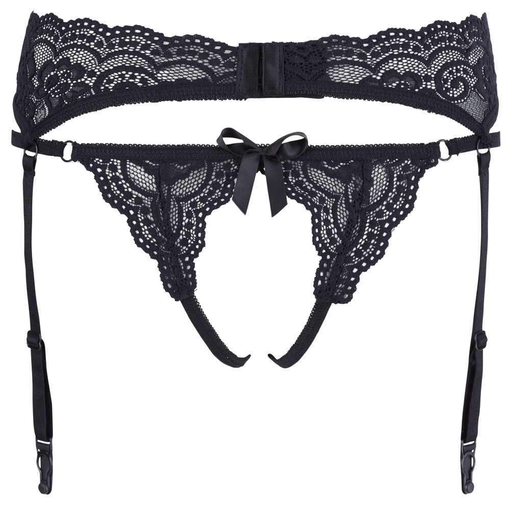 Crotchless briefs and suspender belt made of soft, black lace. Adjustable suspender straps, suspender belt with hook fastener in the back. Stockings not included.