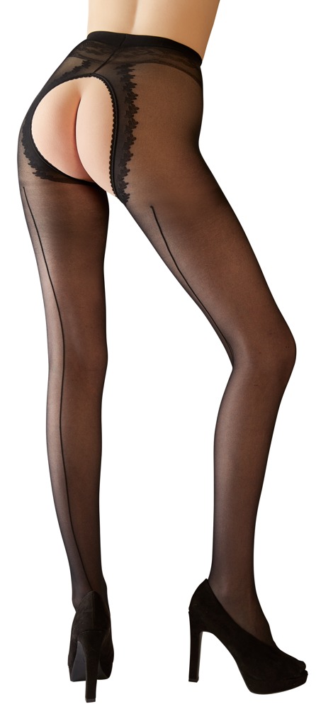 Excitingly open crotch – airy and perfect for spontaneous sex. With reinforced toes and panty part. Black decorative seam down the legs. Black. 79% polyamide, 20% elastane, 1% polypropylene.
