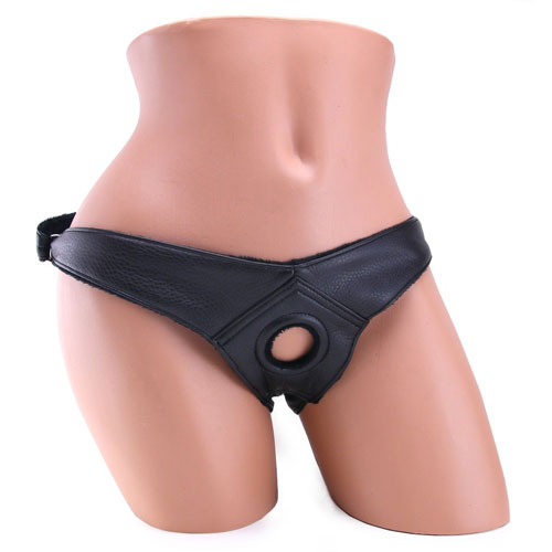 In soft, body-contouring faux-leather fabric with a plush lining and a low-V waistline, a panty shaped triangular yoke fits perfectly over the pelvis, positioning a sturdy, built-in, reinforced rubber O-ring dead center.