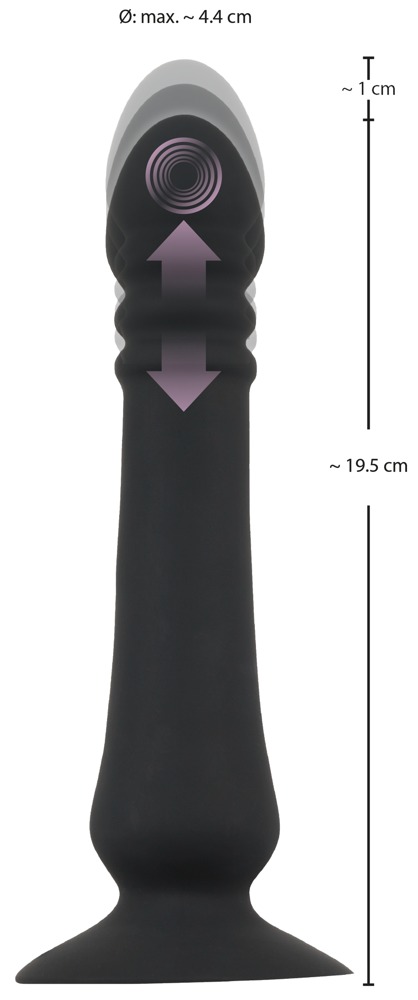 Complete length 19.5 – 20.5 cm, insertion length 18 cm, Ø max. 4.4 cm. Silicone, PU, ABS.