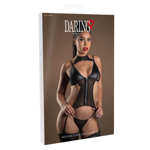 Whether you’re exploring your fantasies or reigniting the passion in your relationship, this Wetlook Zipper Cami Garter Set promises to be the gateway to a world of thrilling intimacy and unforgettable moments. Embrace your inner confidence, unleash your desires, and experience the allure of this enchanting set with matching lace thong. Stockings are not included.