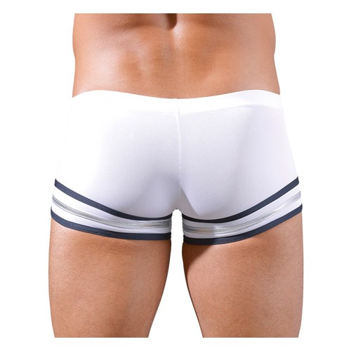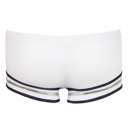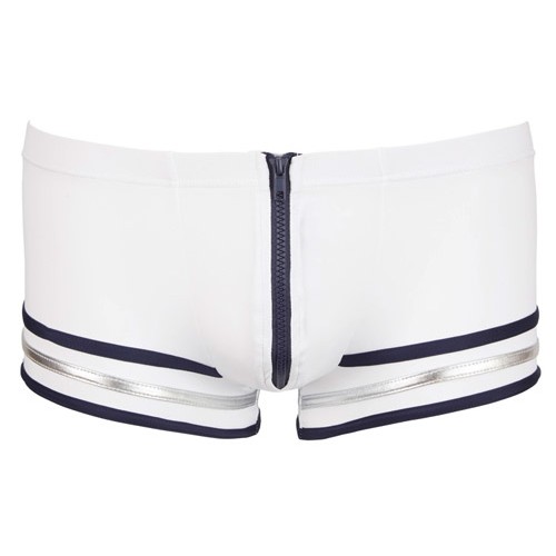 Sailor designed, tight fitting pants with wide plastic zip at the front and three sewn on stripes around the legs.